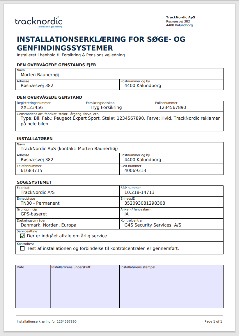 Efterfølgende vil der automatisk blive udarbejdet og sendt en INSTALLATIONSERKLÆRING FOR SØGE- OG GENFINDINGSSYSTEMER om at GPS Trackeren er installeret i henhold til Forsikring & Pensions vejledning.
