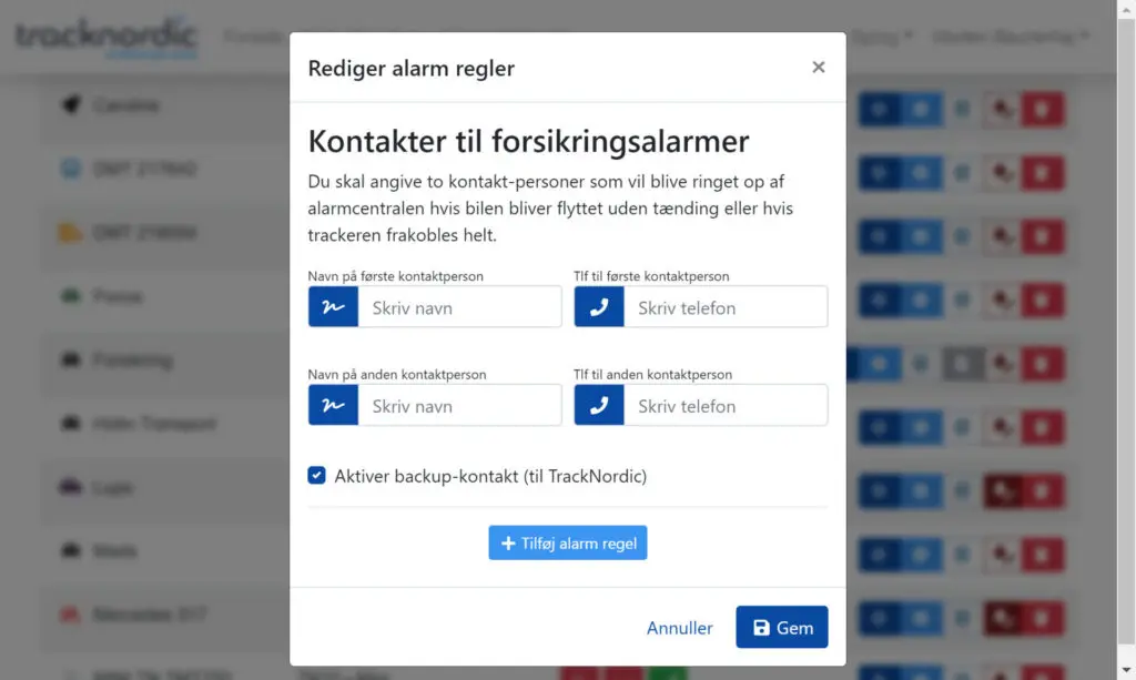 Via TrackNordic’s kontrolpanel tilknytter du nemt to kontakter til trackeren, som straks vil blive ringet op når alarmcentralen modtager en alarm. Hvis ingen af kontakterne svarer, eller ikke kan svare på hvorfor alarmen er udløst, så meldes hændelsen til politiet.